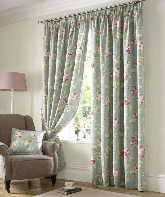 ผ้าม่านวินเทจ พื้นสีเขียวอมฟ้า