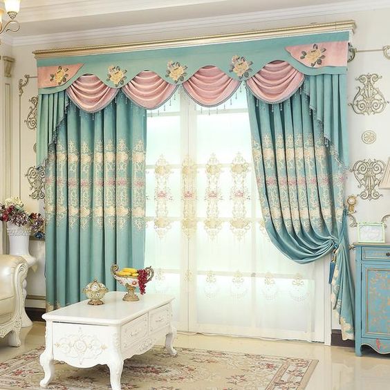 ผ้าม่านสีฟ้า ลายตัดชมพู แต่งห้องหวานๆ