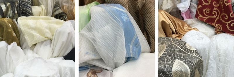 ผ้าทำผ้าม่านโปร่งมีหลากหลายชนิด: ผ้าม่านโปร่งจะมีแบบทอลายในตัว แบบสีพื้น แบบลายปัก แบบลายปัก และแบบดิ้นเงินและดิ้นทอง เป็นต้น การตัดเย็บผ้าม่านโปร่งจะใช้ผ้าเท่ากันกับผ้าม่านทึบแสง และการจัดลอนจะเหมือนกันในกรณีที่มีลวดลายบนเนื้อผ้า อย่างที่เห็นในรูปภาพข้างบนนี้ ผ้าม่านโปร่งที่มีลวดลายสีแดงจะมีดีไซน์เป็นแนวทางตั้ง การตัดเย็บผ้าม่านตาไก่ควรจัดให้ลวดลายผ้าอยู่ตรงกัน ซึ่งก็คือการวางลายผ้าบนสันลอนและท้องลองให้สมดุลกัน ในตัวอย่างนี้ ลายพื้นสีแดงอยู่บนสันลอน ส่วนลายพื้นสีขาวอยู่บนท้องลอน