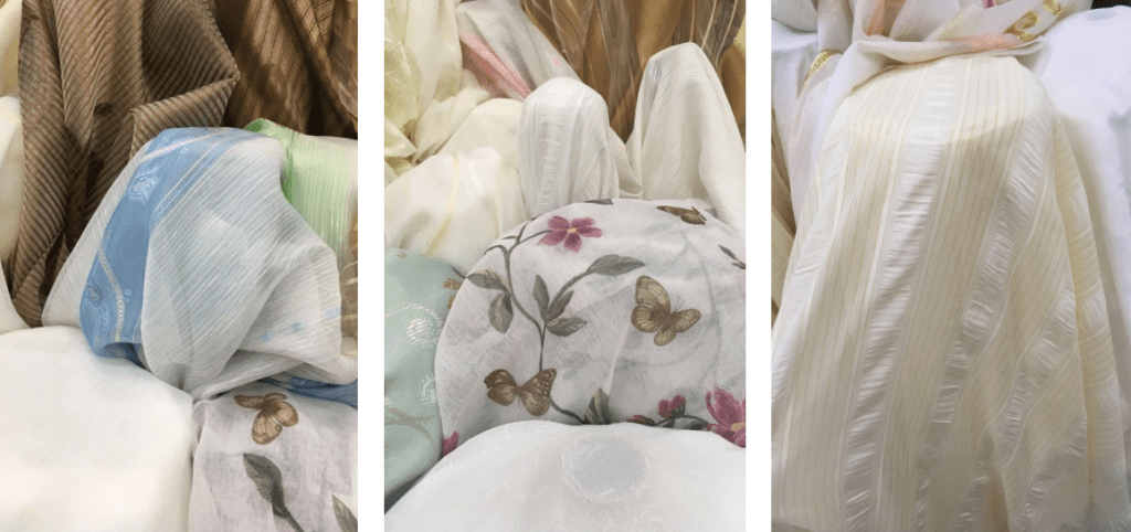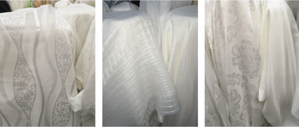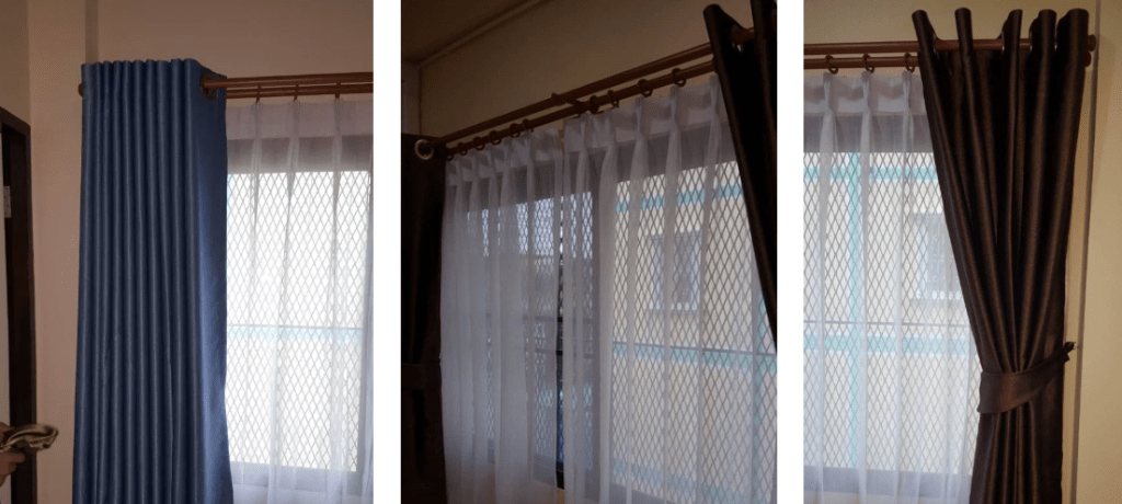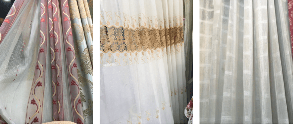 Sheer curtains have many different textures and weaving patterns. Some of them are plain polyester with no inherent design or embroidery, others are fully embroidered with full gold sparkles and elegant designs. When tailoring curtains for window dressing, it is imperative that the designs are in alignment with the curtains itself. For example, in the red curtains in the above image, the patterns are in perfect alignment with the ‘waves’ of the curtains. The red part is on the “crest” of the wave, while the white part is at the trough. Keeping this design in alignment is key to making the curtains look beautiful and balanced.